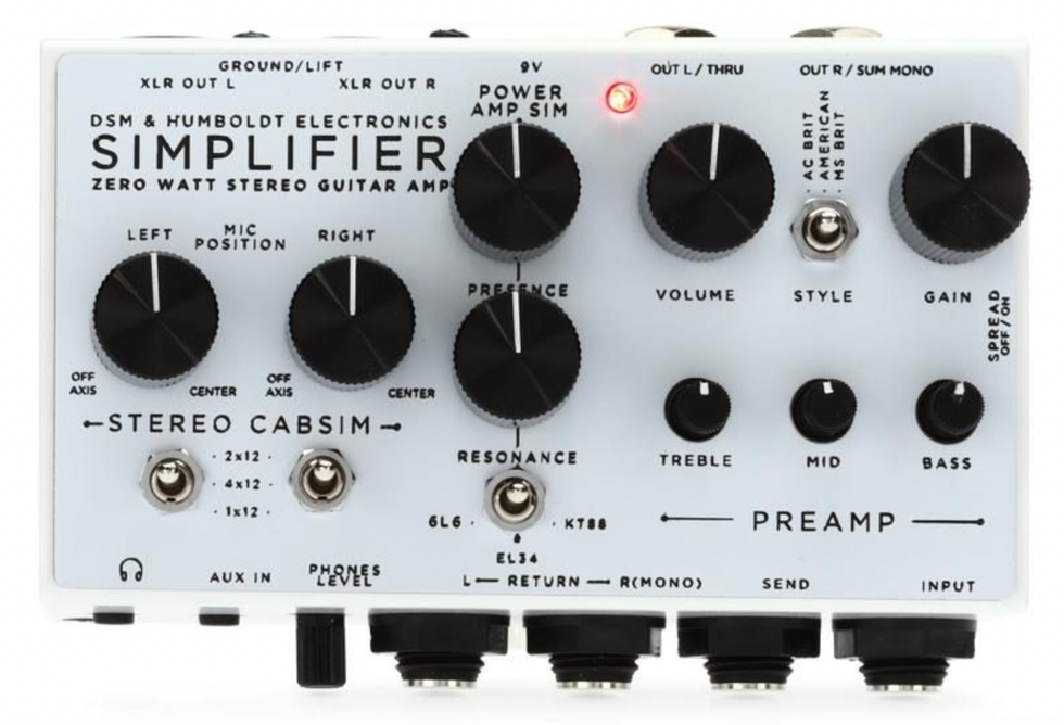 Here’s an entirely analog zero-watt(!) amp that can be run in true stereo with extremely tweakable cab simulation. You can also cycle through three different cab sizes, adjust mic position, and emulate three different types of power tubes.