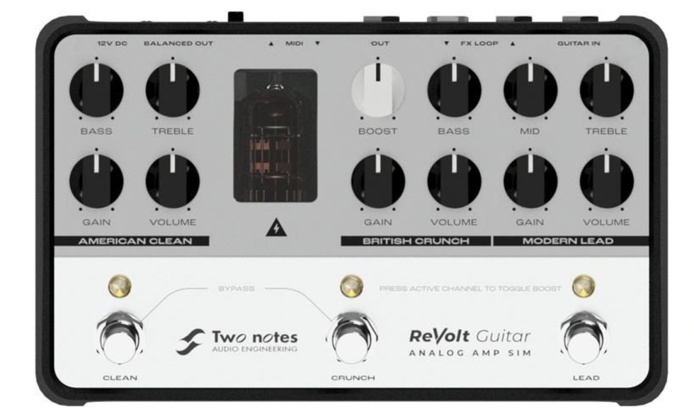 Designed around an actual 12AX7 tube, this unit has an all-analog signal path with three different channels (clean, crunch, and lead) and a switchable boost. It also has Two Notes’ Series-G-DynIR cab emulations, and has a headphone output and aux in for jamming with backing tracks.
