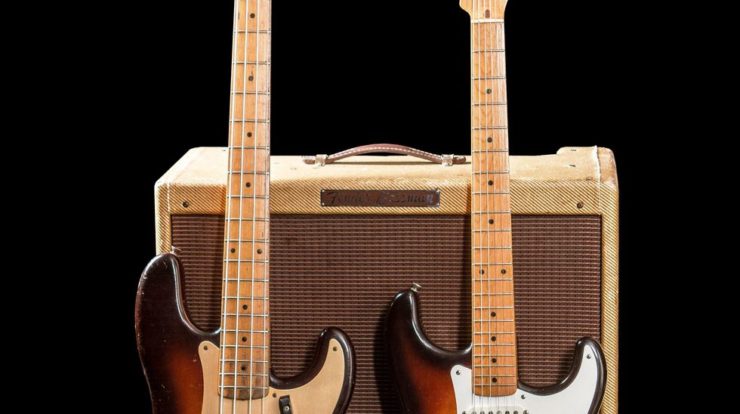 By 1956, Stratocasters and Precision basses switched from ash to alder bodies and were available in two-color sunburst. By ’58, both models switched to three-color sunbursts. The early 1959 Stratocaster and Precision bass we see this month both have vivid, unfaded red in their finishes. These instruments were among the last of the 1-piece-maple-neck versions. By the middle of the year, a separate rosewood fretboard would be added to most Fenders.
