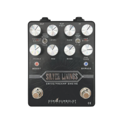 When is an overdrive more than just an overdrive? That might be the question that led the engineers at DSM Humbolt when they came up with the Silver Linings preamp and overdrive. The Silver Linings’ three modes (normal, preamp, and mid boost) and three voicings or “styles” (soft, vintage, and hard) widen the field of possible tones considerably. And just a peek at the controls reveals there are plenty of tone combinations to explore.With a Fender HSS Stratocaster in front of a clean Revv D20, I was impressed with the range of available drive tones. At lower gain settings, for example, the pedal delivers overdrive reminiscent of a driven black-panel Deluxe. The pre boost and pre tone knob can dramatically alter conventional overdrive sounds considerably. The pre tone functions like a tilt EQ—allowing surgical adjustment of highs and lows to reshape drive sounds. The pre boost adds up to 30dB of gain at the input, which gives you extra, and extensive control, of the distortion profile. High gain sounds are a surprise. Cranking the gain and bass in the vintage-style mode generated a fuzzy tone that felt cool and compressed under my fingers. Using the Silver Linings as a preamp, meanwhile, is as easy as plugging the output into the return of the Revv’s effects loop. The results sounded and felt more direct and present, and this feature could be a lifesaver if you’re stuck with a subpar backline.DSM Humboldt Electronics Silver Linings Drive/Preamp Pedal