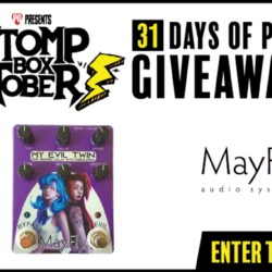 You could WIN My Evil Twin from Mayfly Audio Systems in today’s Stompboxtober Giveaway!My Evil TwinUp to one second delay with pitch-shifting modulation. And that modulation! Pitch shifting modulation on the repeats which makes those delays sound MASSIVE! And the modulation is foot-switchable: leave it on for those big clean chords, and turn it off when you kick in the overdrive for that crushing solo.Repeats controllable from one to infinite.Mix control to perfectly dial in the amount of effect.Tone control to adjust the tone of the delayed signal from a hard bright room to a soft dark room.Foot-switchable pitch shifting modulation with Speed and Intensity controls.Full bypass wth fail-safe relay control; the effect is automatically bypassed if the pedalboard looses power.9V DC input.Stompboxtober Day 5 – Mayfly