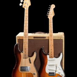If any of you have delved into the history of Fender—and how can you play guitar and ignore it?—you probably know that Leo Fenderintroduced the Precision bass in late 1951, following the success of his radical electric 6-string solidbody, the Telecaster. The P bass proved to be even more groundbreaking. The new-fangled guitar-sized instrument was widely embraced by bassists and guit-pickers alike, following its early appearance in the band of jazz vibist Lionel Hampton and, in rock, in the hands of Bill Black, who used one while supporting Elvis Presley in Jailhouse Rock.In 1954, the Stratocaster was developed with input from players dissatisfied with the Telecaster. Their suggestions—which included a more comfortable body shape, an adjustable bridge allowing intonation for each individual string, and a vibrato system—were incorporated. As we all know, the Strat also added a third pickup and a second tone dial, providing it with more sonic options. The model also was the first Fender with a vibrato bridge. (For a wild example of early Strat vibrato, check out the Ike Turner instrumental “Prancin’.”)These instruments were among the last of the 1-piece-maple-neck versions. By the middle of the year, a separate rosewood fretboard would be added to most Fenders.The lines of the P bass more closely resembled those of the Strat than the Tele. In 1968, Fender would introduce the Telecaster bass, which more directly reflected the look of its original solidbody guitar. By 1957, the P bass’ headstock fattened up a bit, becoming more like the Strat’s, although larger. The P bass also received a new split humbucking pickup to replace the original single-coil.By 1956, Stratocasters and Precision basses switched from ash to alder bodies and were available in two-color sunburst. By ’58, both models switched to three-color sunbursts. The early 1959 Stratocaster and Precision bass we see this month both have vivid, unfaded red in their finishes. These instruments were among the last of the 1-piece-maple-neck versions. By the middle of the year, a separate rosewood fretboard would be added to most Fenders.The original price for this 1959 Strat was $274.50. The current value is $40,000. And the original tag for the Precision bass was $219.50, while the current value is $10,000. If you’re wondering, the amp pictured is a 1958 Bassman Model 5F6-A. This is considered to be the classic version of this model amp. It was originally intended for bass, but guitar players also found it to be exceptional. Just ask Brian Setzer. This circuit was so revered that Jim Marshall pattered his early amps—especially the historic JTM45— after it. Two 5881 power tubes push 45 watts of power through four 10″ Jensen speakers. The control panel houses two inputs each for bright and normal channels, volume controls for each channel, on/off and standby toggles, and presence, middle, bass, and treble chicken-head knobs. The original price was $339.50, and now it’s valued at $7,500.Sources for this article include The Fender Stratocaster by A.R. Duchossoir, The Stratocaster Chronicles: Celebrating 50 Years of the Fender Strat by Tom Wheeler, The Fender Bass: An Ilustrated Historyby J.W. Black and Albert Molinaro, and Fender Amps: The First Fifty Years by John Teagle and John Sprung.