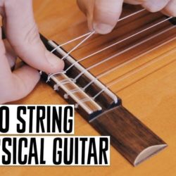 Tips and tools you need to change strings on a classical guitar.Changing strings on a nylon-strung instrument is much different than wrestling with the buttons and wire on a steel-string acoustic. PG’s Nikos Arvantis offers an in-depth tutorial on changing nylon strings, and specifically on a classical instrument—where the number of string holes on the tie block (six, nine, or 12) vary model-to-model. His tools: a normal tension D’Addario string set, a string winder, wire clippers and a headstand. Nikos walks us though one string at a time, from bridge to tuners. He starts by running the bass string through the bridge to the tie block—in this case a 6-hole variant—and displays proper string tying technique. Thinks loops and remain patient. This can be challenging the first few times, and especially so for those with large fingers. Next we move to the headstock. The lowest bass string also needs to be tied securely, and then wound to pitch in such a way that the windings run on the outside of the string roller. For the next two low strings, the windings go to the inside. This avoids string overlap. Next he moves to the highest string, where the light gauge can be especially hard to knot, and also keeps the string on the outside of the roller while winding up to pitch. The next two highest strings go on the inner part of the roller, as with the bass strings. Finally, the loose ends sticking out beyond the knots on the tie block and rollers are trimmed with the wire cutter. And violá! If your nylon-string guitar has a nine- or 12-hole block, consult the manual or other sources.