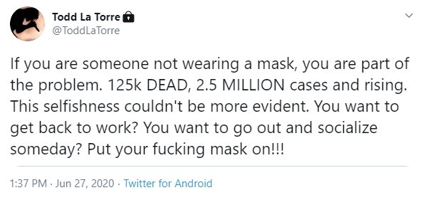 QUEENSRŸCHE singer Todd La Torre says that it is the height of selfishness to not wear a mask.