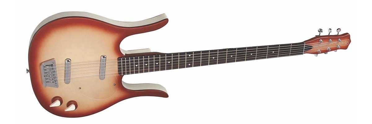 The tone and volume knobs, too, are a slight deviation from vintage spec (originals had no tone control). But the teardrop tone controls here are a pleasure to use, and the concentric volume/tone knobs are a bit of minor design genius. The copperburst finish is not quite as copper as some finishes you see on vintage Danos—it has just a touch of ruby or pink in places. But it is lovely nonetheless, particularly on this body style, and it’s flawlessly applied. The aluminum nut, by the way, is a very cool vintage-inspired touch that contributes to the instrument’s sense of solidity.