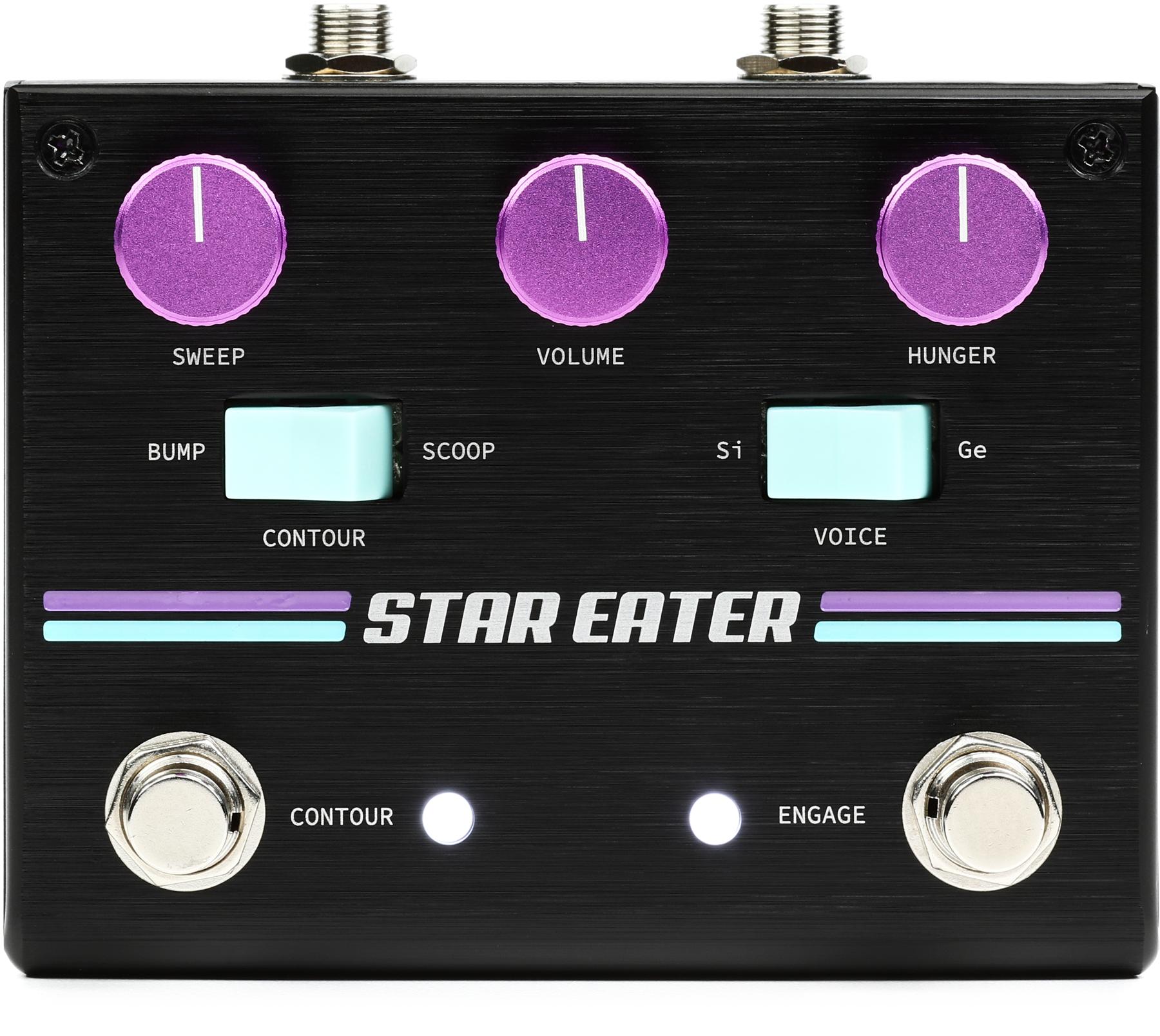 Star Eater is an all-analog, dual footswitch super-jumbo Fuzz with a footswitchable booster and variable filter stage, allowing players to easily sculpt a massive array of inspiring, unique fuzz tones. On the fuzz side, newly-available, precision-matched transistor pairs are utilized to ensure that each and every unit is perfectly dialed in to “the sweet spot” that can be so elusive to find in vintage pedals. A rocker switch provides your choice of Germanium or Silicon color. Downstream from the fuzz, a powerful booster stage drives the filter in the Star Eater. Scoop and Bump voicings for the filter can be selected via a rocker switch, drastically changing the frequency response of the Sweep control throughout its entire range. Built to last and designed to inspire, the Star Eater brings a unique approach and a new standard of performance to the world of boutique fuzz pedals. Runs on standard 9VDC.