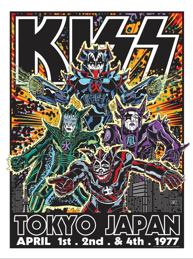 Kozik‘s poster commemorating the legendary KISS performances from April 1, 2 and 4, 1977 in Tokyo, Japan, is the second design in the Echo “Kiss Poster Series”. This 11-color screen print measures 18″x24″ and is available in these limited-edition variations: