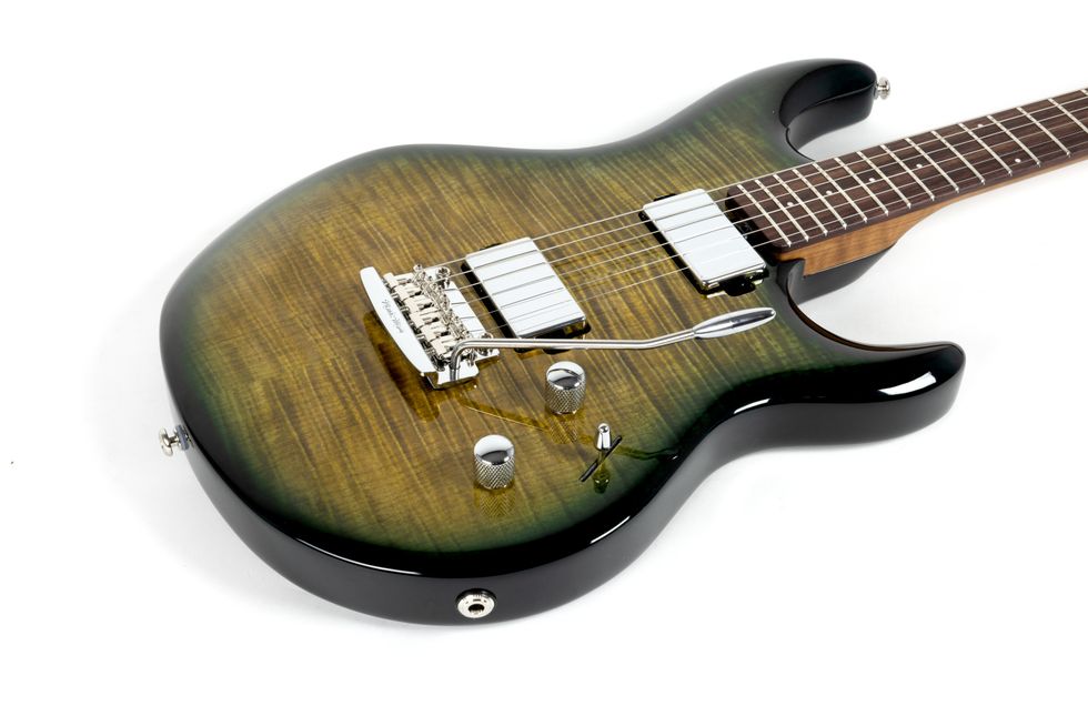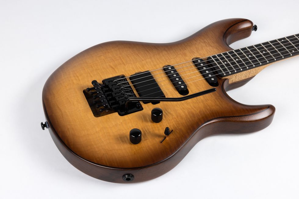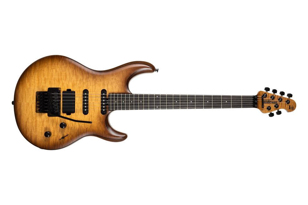 Featuring a Steamroller Walnut Burst satin finish, this anniversary edition combines a beautiful flame maple top seated in an exotic Black Limba body with a figured roasted maple neck and ebony fingerboard. The Ernie Ball Music Man designed HT HSS pickups deliver an incredibly dynamic and responsive playing experience and can achieve an ultra-high-output, powerful low-end response while retaining a distinctively clean, clear tone at lower volume levels. Also unique to this limited edition model is a Music Man double locking tremolo.