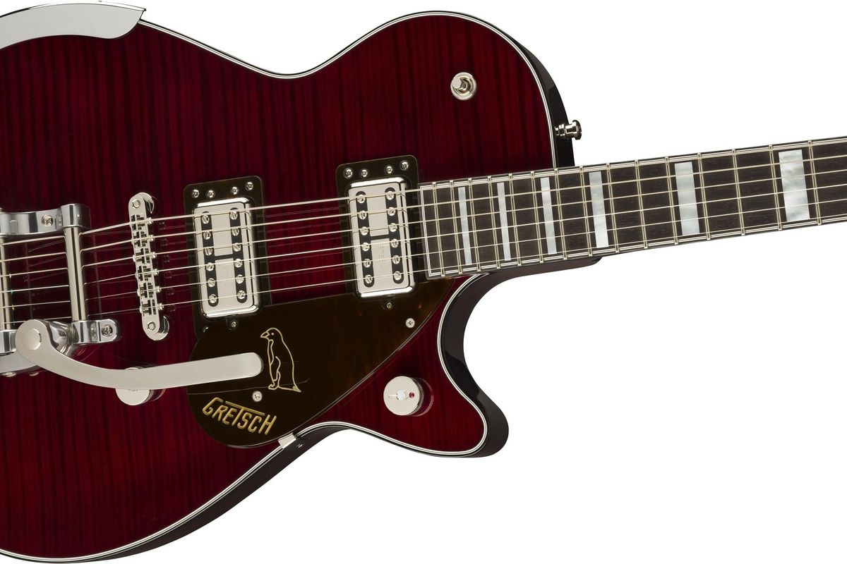 The Penguin’s single-cutaway chambered mahogany body with flame maple top captures the harmonic richness and resonance of the top and body for a livelier, more articulate tone. Designed by the famed Tim Shaw, the highly versatile BT65 Broad’Tron pickups meticulously capture the guitar’s sonic palette and reproduce the perfect mixture of wall-shaking power and full-spectrum fidelity.