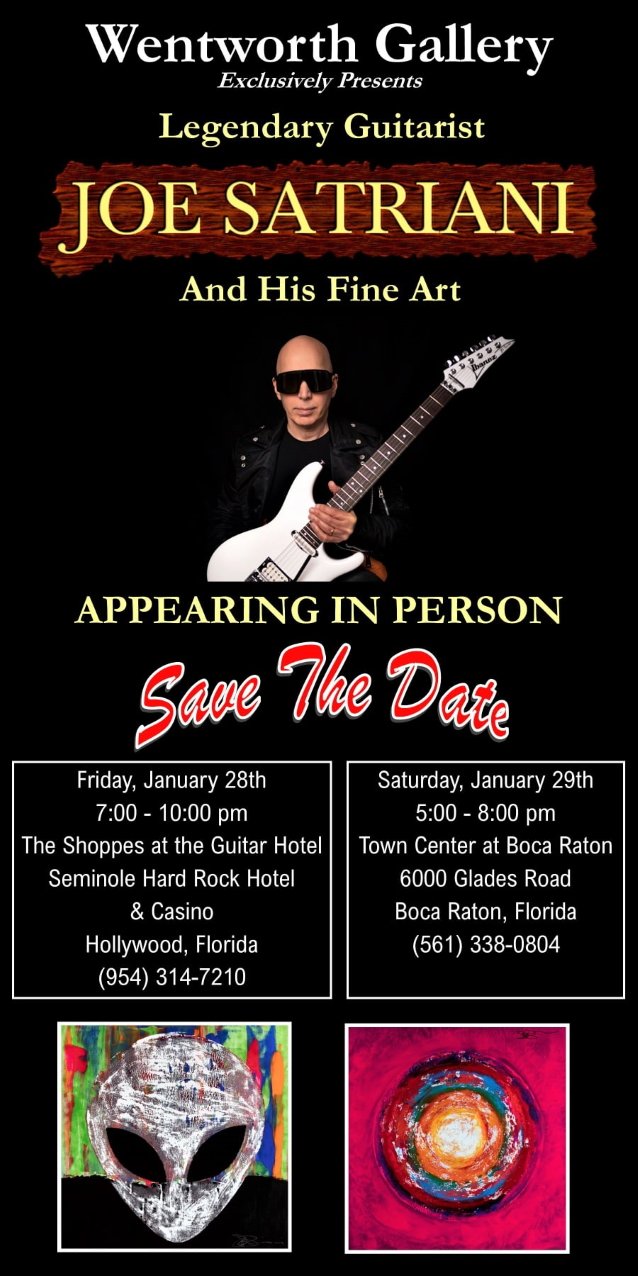 Joe Satriani, the legendary world-renowned guitarist, is planning his first foray as a touring visual artist with showings debuting at two Wentworth Gallery locations in January 2022 — Friday January 28, 7-10 p.m. at Hard Rock Hotel & Casino in Hollywood, Florida and Saturday January 29, 5-8 p.m. at the Boca Raton location.