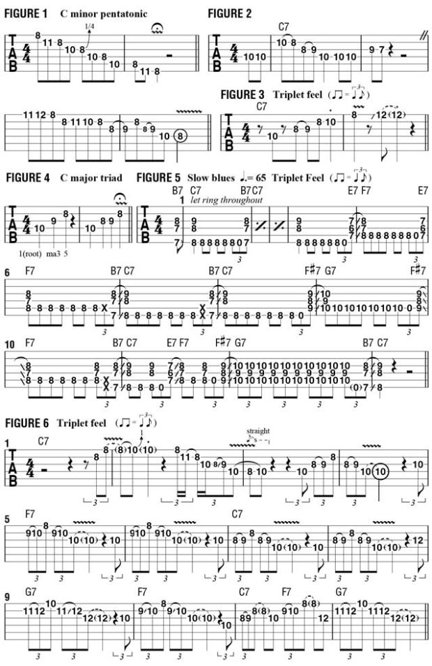 As guitarists, we’re often introduced to blues playing via two-notes-per-string patterns, such as the C minor pentatonic scale (C Eb F G Bb) illustrated in FIGURE 1. Not to underestimate the importance of this basic shape (after all, it is the source position of so many of our instrument’s most enduring licks, from Robert Johnson to Randy Rhoads), but in terms of playing an expressive solo with a blues flavor, this is a tiny component. Blues is based on a dominant seven chord. Things get more colorful (“blue”) when you emphasize a chord’s third and/or seventh with the minor third approaching the major third, either ascending or descending.