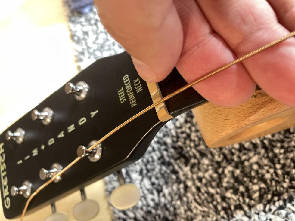 1. Stretching the strings several times after setting them up by simply pulling them upwards with your hands will speed up this process noticeably. There are also tools for this called string stretchers, but you can simply do it with your hands. This is called pre-stretching and is very simple to do. As a rule of thumb, steel strings will settle sooner than nylon strings.