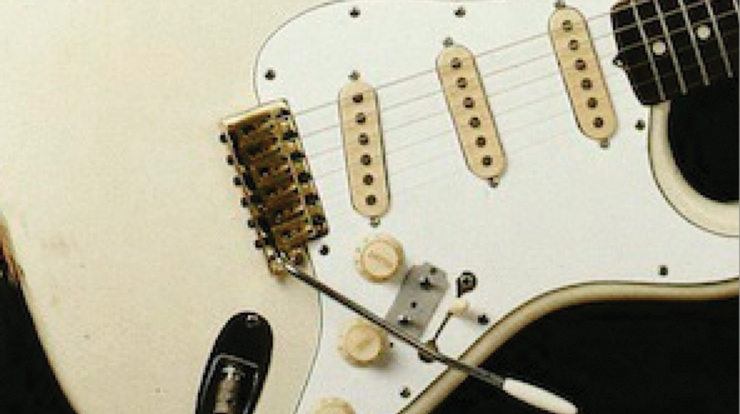 King is known for playing ’70s Fender Stratocasters in vintage white with the era-correct big headstock, rosewood fretboard, and white pickguard, plus two modifications that are quite unique. Have a look at the cover of his Greatest Hits record from 1983 in Photo 1 (there’s his famous smile). Between the 5-way pickup-selector switch and the volume and tone controls, you can clearly see a small metal plate containing two small toggle switches.