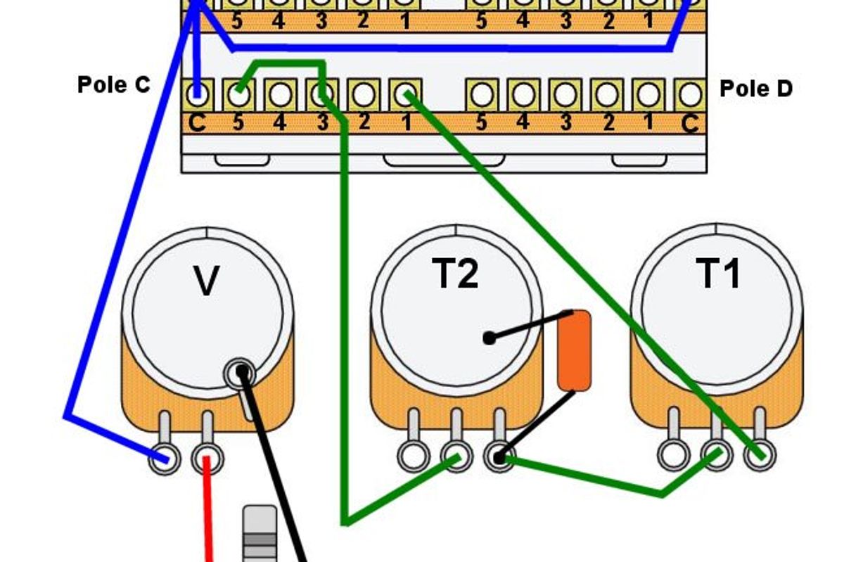 What makes this wiring special is that the two tone controls are freely assigned, and the tone control is bypassed in the two in-between positions. So, the switching matrix for the Henderson wiring goes like this: