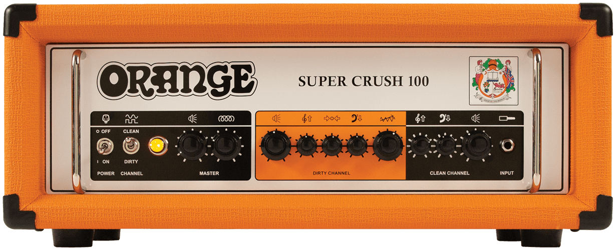 Like all Orange amps, the Super Crush 100’s control panel can be a little confusing to decipher if you’re new to the brand. Pictographs rather than words describe the function of each knob, but knowing what’s what becomes intuitive quickly. Otherwise, the layout is pretty straightforward. Master volume and reverb are shared by both channels. The dirty channel’s controls include volume, treble, middle, bass, and gain. The clean channel has controls for treble, bass, and volume.
