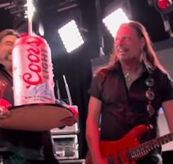 WINGER guitarist Reb Beach celebrated his 60th birthday onstage with his bandmates on August 31 at the Whisky A Go Go. Before launching into the song “Pull Me Under”, Beach was presented with a birthday cake in the shape of an oversized can of Coors Light.