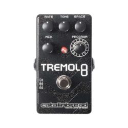 The clever Portlanders at Catalinbread have always been great at the design game. And the new Tremolo8 shows how much creativity they continue to squeeze into a compact pedal enclosure. At just 4.25″ x 2.25″ x 1.12″, the Tremolo8 is no larger than the average small-format, single-footswitch effects pedal. The price isn’t much more than your average compact stompbox, either. Yet, impressively, the Tremolo8 packs the kind of deep-dive functionality you’d expect from a chunky, more expensive, double-wide unit. Catalinbread says the Tremolo8 is rooted in attempts to create a convincing digital version of a brown-panel Fender Showman’s harmonic vibrato. But once that nut was cracked, Catalinbread just kept going. The result is an eight-function modulation-plus-reverb pedal with copious capabilities. Twisting the dial, you’ll find classic variations on much-loved Fender- and Magnatone-style tremolo effects that can be used with and without reverb, tremolo modulated with chorus, envelope-controlled tremolo, ring modulation, and more. Eight Isn’t Quite EnoughIn addition to the 8-position rotary program selector, the Tremolo8 is host to controls for rate, tone, space, and mix. Generally, those controls perform as you’d expect, but they can vary in function depending on the selected program. For instance, the type of reverb regulated by the space knob ranges from tight with medium-to-short trails to ethereal and atmospheric. In the sine-wave-with-chorus program, however, it governs the depth of the chorus. Similarly, the tone knob takes on unexpected functions in a few settings—controlling the length of the “duty cycle” (aka pulse width) in the square wave program, for example, or the speed of the release in the envelope-controlled tremolo.“The envelope-triggered tremolo was surprisingly tasty, offering an easy route to that evocative sound of a Leslie slowing down when you hit the brake switch.”More tone-tweaking options are available via two internal controls: an internal gain trimmer and a buffered/true-bypass option for the footswitch. Buffered mode allows reverb trails to fade naturally even after the pedal is switched off, while also conditioning your signal for the rest of its journey. There’s no room for a battery inside, but the Tremolo8 can run on DC power from 9-to-18 volts into a standard center-negative input and draws at least 60 mA. Operating at higher voltage levels increases headroom and even delivers a dry signal boost. Trem de la TremTested with a Les Paul, a Jazzmaster, a tweed Deluxe-style 1×12 combo and a 65amps London head and 2×12 cab, the Tremolo8’s many trenchant and useful tremolo and reverb sounds proved much more than one or two good settings and a bundle of oddball filler. Dialing between the sine wave, square wave, sawtooth, and harmonic vibrato settings felt much like swapping between classic vintage amps. A gamut of classic ’60s Fender tremolo sounds were easy to approximate. I also heard hints of Magnatone, Valco, and Gibson amp tremolo types, among others. Beyond the standard tremolo fare, the envelope-triggered tremolo was surprisingly tasty, offering an easy route to that evocative sound of a Leslie slowing down when you hit the brake switch. The ring modulator, too, offered a clever rendition of this effect, if one I probably wouldn’t use too often. On top of the tremolo sounds, the reverb textures are excellent and well-executed. Sure, the reverb only has one control, but the basic depth and dimension of the effect itself is on par with many dedicated reverb pedals in this price range. In addition to the impressive variety of sounds, the overall sound quality of the pedal and of each individual setting is fantastic. You hear warmth, depth, and great clarity, as well as just a little of the requisite “swooshing” white noise in the tremolo that pulses in time with the rate, adding a cool analog color. The VerdictI have been a tremolo nut for years, and despite the effect’s essential simplicity—volume on, volume off—I still find it one of the most atmospheric and evocative effects one can use. But as familiar as I am with tremolo, I haven’t been this excited about a new trem’ pedal in a long time. Even if the Tremolo8 featured just one or two of the best settings, I’d consider it a winner. But when you add in a boatload of odd and uncommon tremolo options working in harmony with a great-sounding reverb, you have a gobsmacking success on your hands.Catalinbread Tremolo 8 Pedal with Reverb