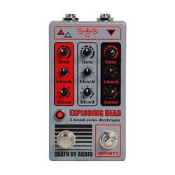 If you don’t follow the many-splendored musical world of noisy psychedelia, you might be surprised to know that Oliver Ackermann, co-founder of the sometimes psychotic but often thrilling stompbox concern Death By Audio, also helms the equally psychotic and thrilling band A Place to Bury Strangers. If you’ve seen APTBS live, you’ll understand much about what makes Death By Audio pedals unconventional. APTBS is generally a sensory overload experience. They are loud, sonically confrontational, and capable of oscillating between chaos and dark beauty. Last year marked the 13th anniversary of the band’s breakthrough LP, Exploding Head, and, in typically perverse fashion, Ackermann elected to celebrate that most unlucky of anniversaries with a triple delay named in the LP’s honor.In very relative terms, the Exploding Head seems normal compared to many DBA pedals. It’s three identical delays run in series. Simple, right? But that simplicity belies great range and a deep capacity for weirdness and subtlety. Exploding Head creates washy reverbs, percussive multi-head delay effects, and mutant delays that chatter like rogue tremolos. It can feel quirky and tricky to handle as you get to know it’s weird ways. But mastering just a few simple tricks makes the Exploding Head an engaging, painterly, and even practical effect.Honed To Honor the HeadDelays arranged in series are one of the coolest ways to mangle and massage sound and time. I often prefer the texture and complexity of two simple delays to traditional delay-and-reverb setups because fewer overtones and harmonics go missing in the wash. In fact, a two-delay setup can actually enhance certain overtones as echoes intertwine and collide. The Exploding Head expands on this concept and enables deep exploration of those interrelationships.The Exploding Head is effectively an evolution of DBA’s own extinct and much-coveted Ghost Delay—an effect instrumental in creating the blown out, industrial, Jesus and Mary Chain-meets-Isn’t Anything haze of Exploding Head. The Ghost Delay utilized three cascading delays as well, but featured preset wet/dry blends instead of the three independent blend controls on the Exploding Head. That design change, however, makes a big difference.”The bright, rhythmic underpinning of the echoes makes individual delay lines more distinct as you add in others.“Controls are superficially simple. There are delay time, feedback, and wet/dry blend knobs, just as you’d see on any delay. But like an analog synthesizer, the interactivity between the three cascading sets of controls makes it hard to replicate sounds precisely, and there are no presets or digital control. Practice and tuning your ear to the pedal’s quirks and tendencies helps you engineer roughly identical setups pretty readily. Still, I was inclined to snap pictures of settings that made my favorite sounds—just in case.Exploding Head’s infinity switch is another treat that distinguishes it from the Ghost Delay. Engaging it feeds the output from the third delay in the sequence (red) into the first (black), which enables momentary self-oscillation effects. The addition of this option—on top of a delay array that already lives happily at the edge of feedback and creates blurry washes of polyrhythms—makes the Exploding Head a delightful chaos engine if you choose to take it there.Willows and HurricanesThe Exploding Head’s chaotic side is a big part of the pedal’s personality. But it can be civilized and subdued, too. It happily generates trad delay textures. And when you get a feel for how Exploding Head works as an organism, you’ll find a varied lot of echo colors that are as familiar as they are freaked out.While digital, the basic tonality of a single Exploding Head delay line is not worlds apart from a bright analog echo. It’s a touch trebly. There is also perceptible clock noise at many settings, just like an analog unit. This can be jarring at first if you like your delay lush and dreamy, but the bright, rhythmic underpinning of the echoes make individual delay lines more distinct as you add in others, which also has a thickening and darkening effect that blunts the clock noise.A good place to start exploration of the Exploding Head is to turn all the blend controls to completely dry settings, set the time and feedback controls to near-identical levels (each at high noon is a good place to start,) and then advance the blend of the first delay until it sounds right. As you slowly, incrementally elevate the blend levels of the other delays and shift the other parameters, you’ll hear the signal get thicker and wider. And, depending on your time and blend settings, the pedal will generate wild multi-head patterns or subtler variations that have the quality of tremolo or chorusing.Like any delay, you can use short delay times, dry blends, and long feedback levels to approximate reverb textures. These are a great addition to composite delay images in any position. But I found that situating reverb-like textures in the middle position enables the most ambient colors. The middle delay can also be critical in creating polyrhythmic echoes. Mating a delay-forward blend setting to an odd subdivision of the first delay generates complex percolating repeats that vary in volume. It sounds a little like a multi-head delay arranged via William Burroughs cut-up method—disorienting but also a source of sound poetry that shifts your perspective dramatically.The VerdictIt seems preposterous to try to assign ratings to the Exploding Head. Some players will find great utility in the pedal, readily encounter beauty in the intermingled echoes, and get blissfully lost exploring the interactive controls. Other players will be baffled. Given that, a prospective customer should be prepared to round up or down—particularly where the tone and ease of use scores are concerned.One thing all users will agree on, though, is that the Exploding Head 