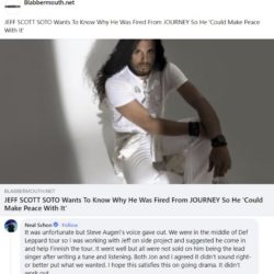 Schon responded to Soto’s remarks in a comment on the BLABBERMOUTH.NET Facebook page. “It was unfortunate but Steve Augeri’s voice gave out. We were in the middle of DEF LEPPARD tour so I was working with Jeff on side project and suggested he come in and help Finnish the tour. It went well but all were not sold on him being the lead singer after writing a tune and listening. Both Jon and I agreed it didn’t sound right- or better put what we wanted. I hope this satisfies this on going drama. It didn’t work out.”
