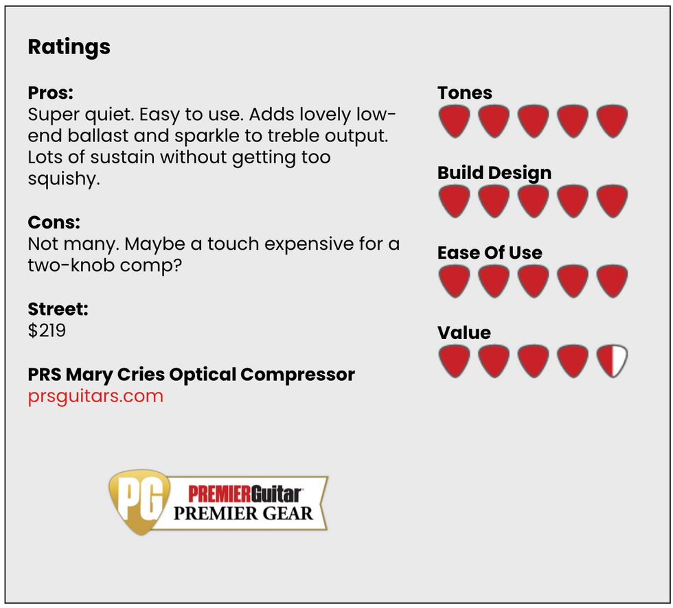 Like the Horsemeat, the Mary Cries comp hints at a possible PRS design team directive: That a guitar’s fundamental voice should always be able to be its best, most exciting self. That’s no surprise for a company whose instruments are typically so rich and sonorous. But like the Universal Audio Teletronix LA-2A optical studio compressor that inspired it, the Mary Cries succeeds so well that it could probably make a busted kazoo shine.