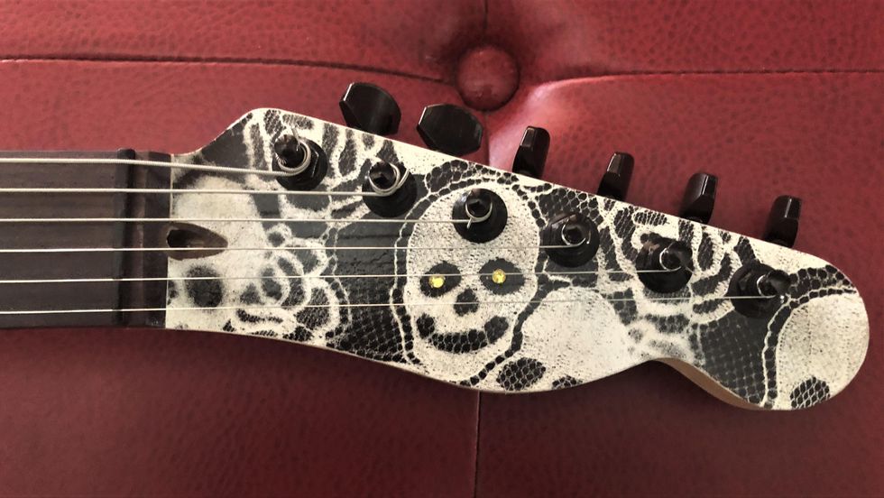 I added a custom Warmoth Tele neck with rosewood fretboard, boatneck carve, 6100 nickel frets, and finished it with wipe-on poly. Doug Shepherd, at Doug’s Custom Neck Plates out of Texas, designed a skull neck plate for me. While waiting for various parts to arrive, I decided the skulls would look sinister if they had eyeballs. I inlaid yellow 3 mm crystal rhinestones into each socket so the guitar could stare down its audience. I selected a skull-approved DiMarzio Super Distortion for the bridge and a Duncan Hot Stack for the neck and kept it simple with a 3-way switch and volume. It sounds downright “skullduggerous” played through a TC Electronic Fangs into a cranked Quilter Aviator Mach 3. My neighbors seem to love it!