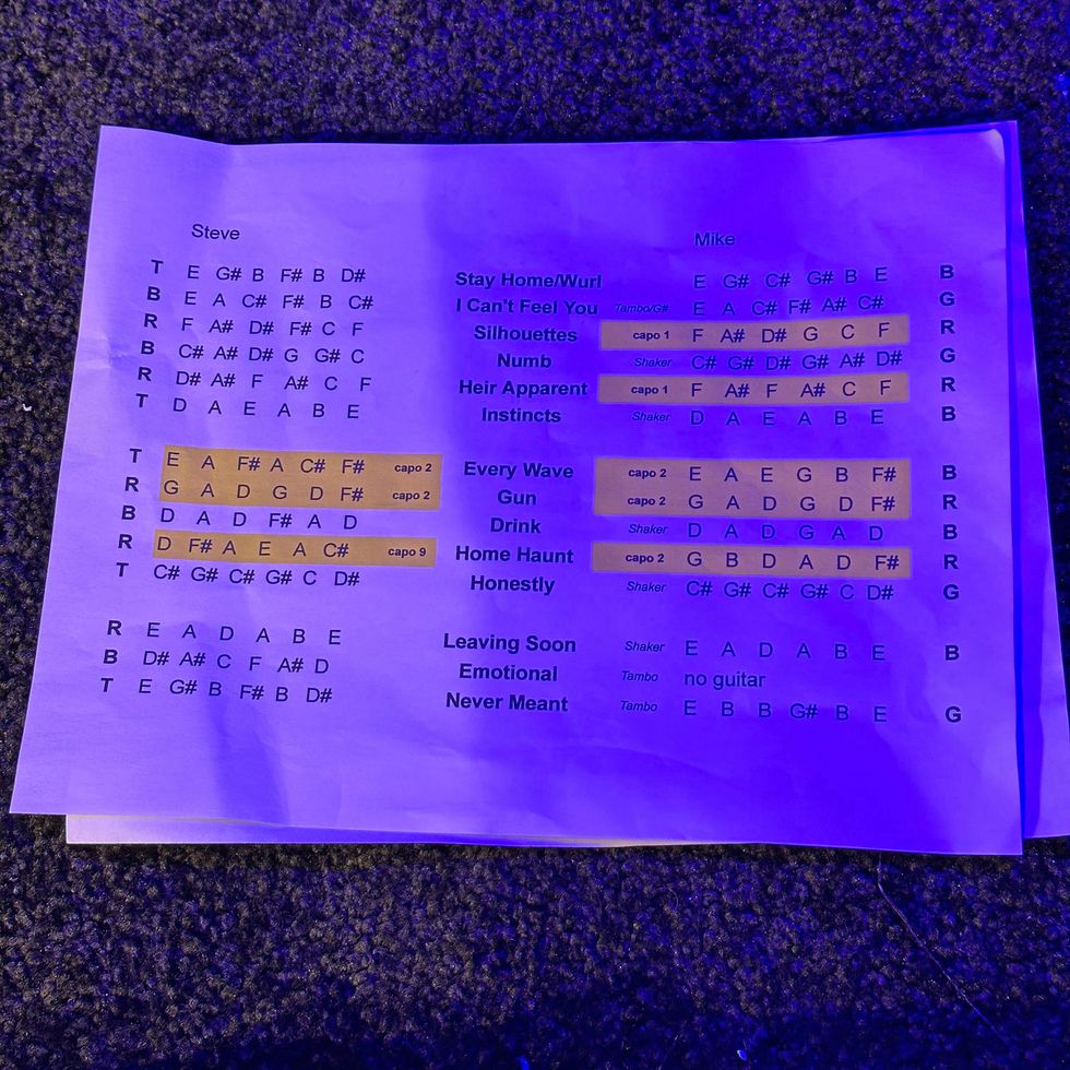 Guitarists Mike Kinsella and Steve Holmes rarely play in the same open tunings. To make sure each set goes smoothly, the band’s tech Mike Garzon has veto power on song inclusion and order based on what he can pull off while also being an auxiliary member covering percussion and keyboards. Here’s a cheat sheet that helps map the choreography each song needs and where it could potentially work in the set.