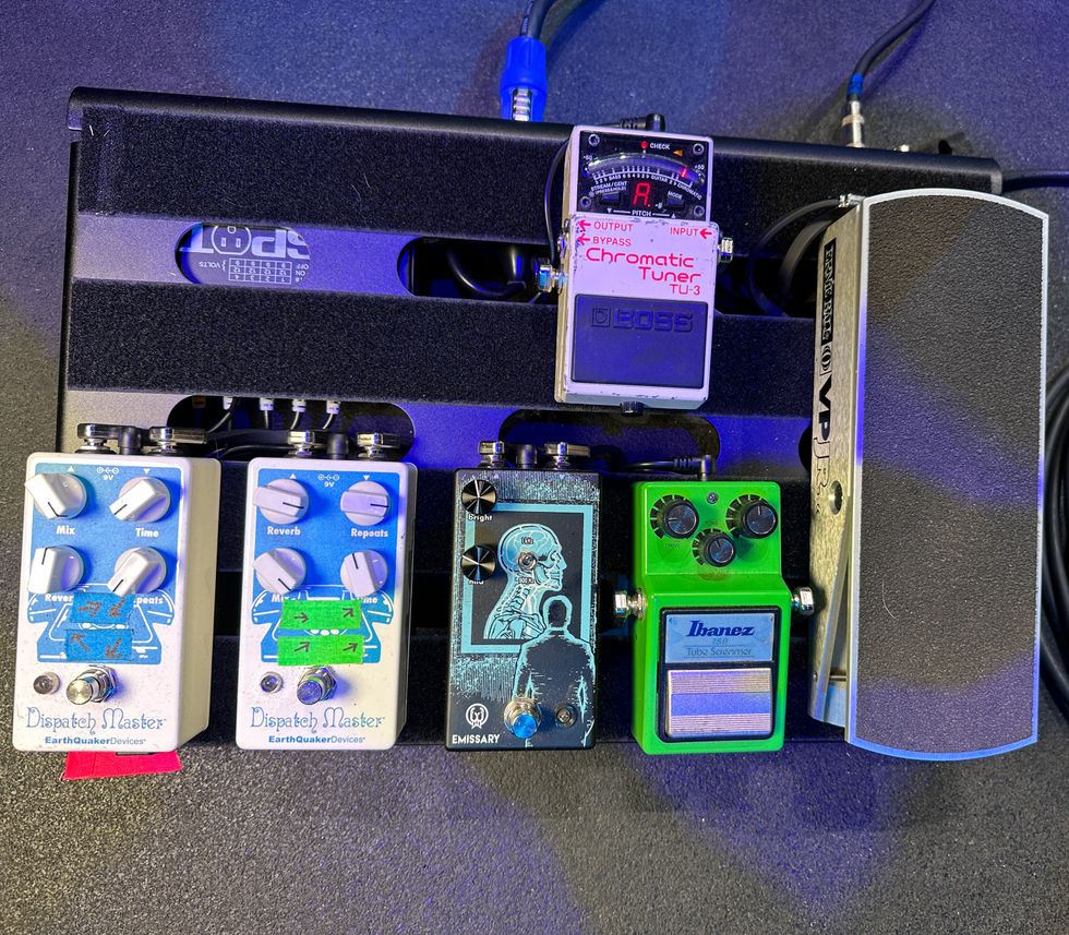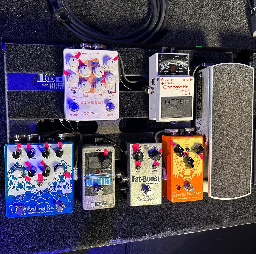 The double EQD Dispatch Master layout is giving Steve a reverb wash while the second dream box adds in delay on top of the reverb. He will occasionally engage them both to build a climactic moment in a song. The Walrus Audio Emissary parallel boost works to push the signal and the Ibanez TS9 Tube Screamer adds in some snarl. Holmes relies on an Ernie Ball VP Junior 250K for dynamics and a Boss TU-3 Chromatic Tuner to keep his Fenders in check.