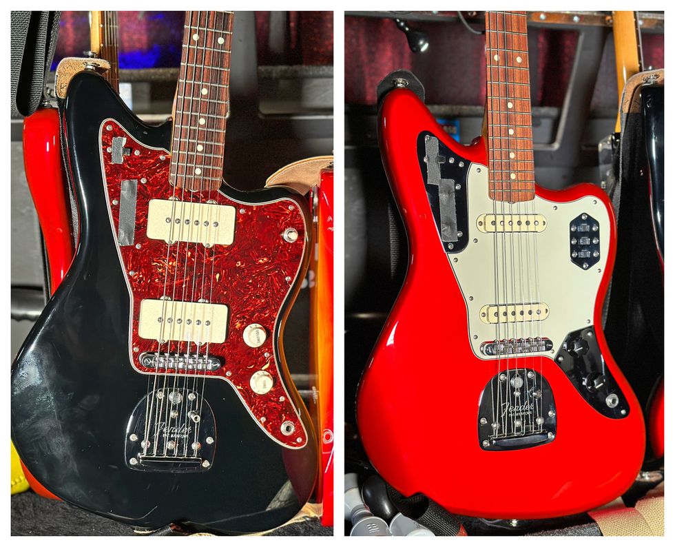 The Fender American Professional Jazzmaster gets stage time with Steve for the lowered tunings in their catalog, where the Fender ’60s Jaguar Fiesta Red works in the set for parts that require a more high-end, shriller attack.