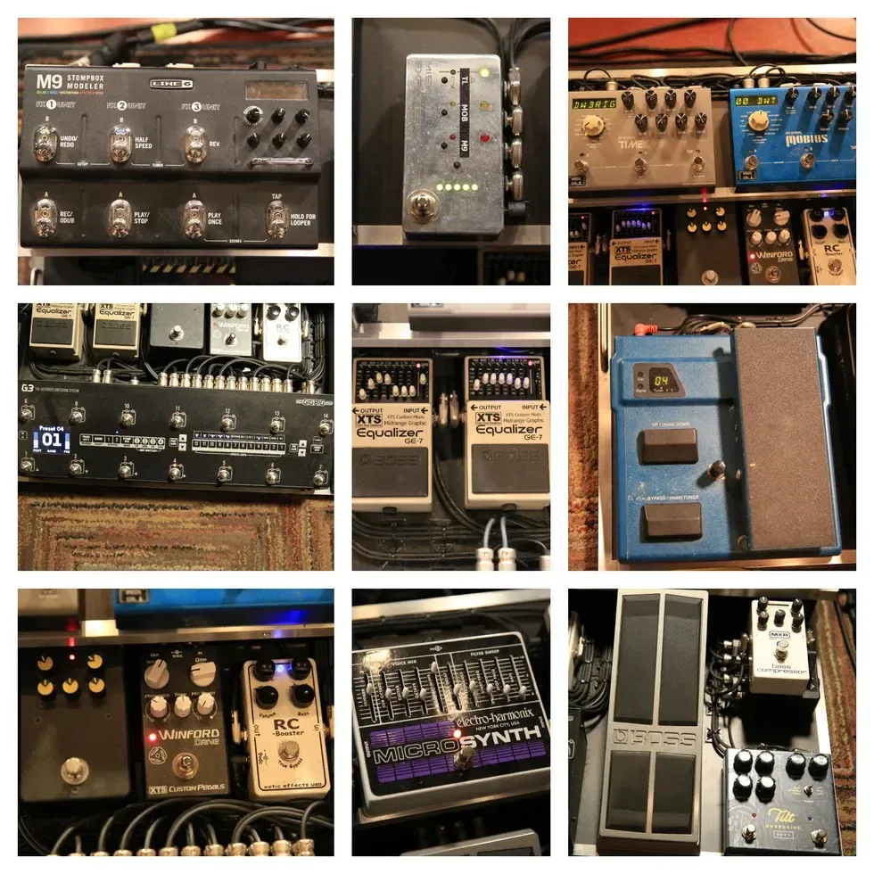 XTS constructed Wells’ do-it-all-and-then-some board utilizing a Gig Rig G3 Switching System. Right now, the stomp headquarters includes a Line 6 M9, Strymon’s Mobius and Timeline, a Mission Engineering Expressionator, Electro-Harmonix’s Micro Synth, a MXR Bass Compressor, and doubles of the Boss GE-7 Equalizer (which have both been modded by XTS). Wells gets his dirt from an Ibanez MT10 Mostortion, a REVV Shawn Tubbs Tilt Overdrive, XTS’ own Winford Drive, and Xotic’s RC Booster. A modded Digitech XP series pedal, a Boss FV-500H, and a Dunlop DVP3 round out the collection.