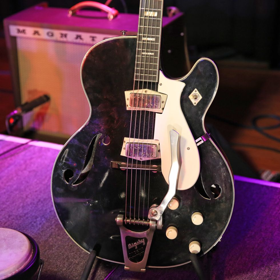 Like their muse the desert, the brothers’ setups are sparse. Each one totes a single hollowbody. Alejandro travels with his 1963 Silvertone 1446, which is stock except for a refret and custom-made, snake-like Bigsby arm, both done by longtime Dan Auerbach tech Dan Johnson. (You might recognize Dan from his three different Black Keys Rig Rundowns. Check out the latest one from 2019!)