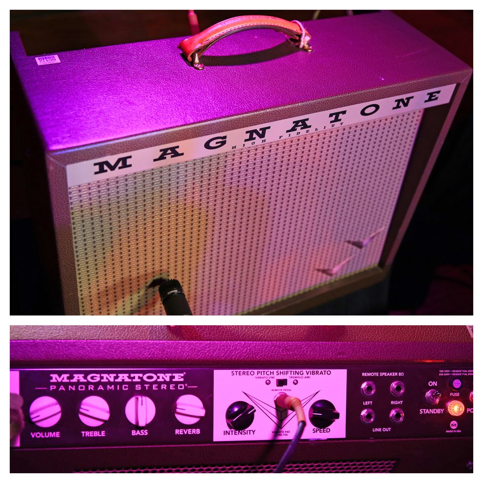 When creating El Bueno Y El Malo, Estevan plugged into Auerbach’s vintage Magnatone for the whole recording process. (You can really hear the amp’s magic vibrato pulsing during the album’s opening title track.) For this show, he compromised by running his 6120 into a modern Magnatone Panoramic Stereo model.