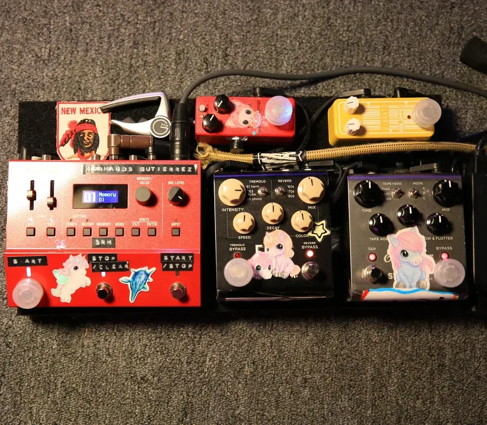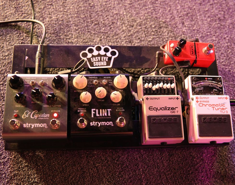 The remaining effects for Estevan include a Malekko Omicron Vibrato, a Boss RC-500 Loop Station, and a Boss TU-3 Chromatic Tuner (off the board) keeps his Gretsch in check. Lastly, you’ll notice a G7th Performance 3 ART Capo on the pedalboard, too.