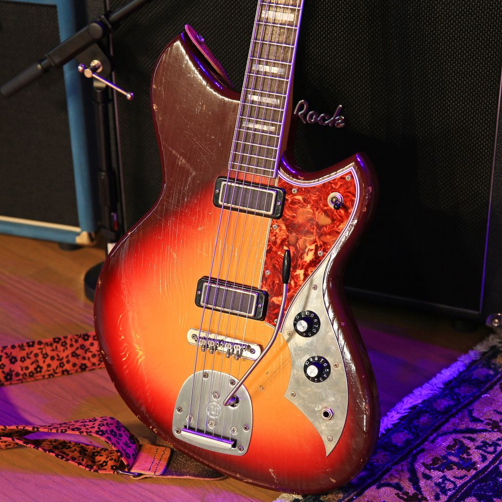 Joey mainly keeps this Novo baritone, which was built in Nashville and features Lollar pickups, in low open tunings. He’s worked with Stringjoy to get just the right strings to play comfortably in those tunings. “That’s the thing about those guys,” he says, “is you can say, ‘I like .011s in E, what would be a comparable set of strings for D? And they’ll plop it into their computer and say, ‘This is what we think would be comparable.’” Joey asked the company for a set that would work with an Ab tuning on the baritone, and they hooked him up, but—“I have no idea what’s on this guitar. I hope I don’t break a string.”