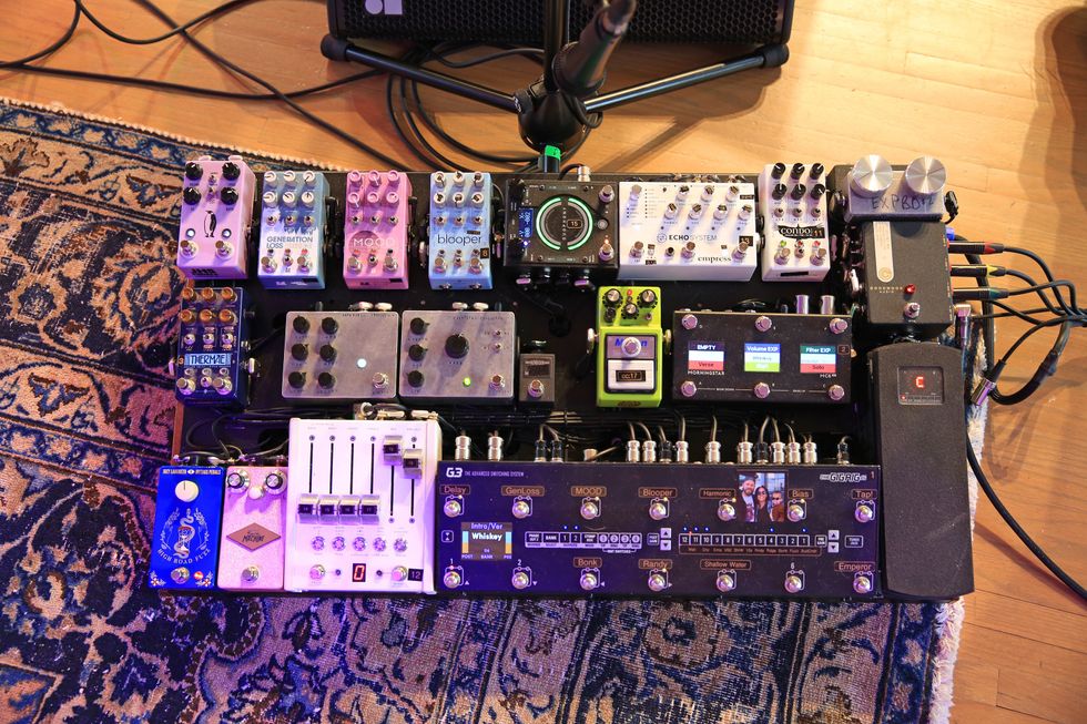 Mounted on a pedalboard made in Melbourne, Australia, all of Joey’s pedals go directly into the GigRig G3, with the wet effects all going into a Morningstar ML10X that lives under the board. It allows Landreth to do more complex routing with custom routing for every preset, and also lets Landreth only use one stereo loop for all wet effects. Those pedals include the Empress Echosystem, Chase Bliss Thermae, Chase Bliss Blooper, Chase Bliss MOOD MkII, Chase Bliss Generation Loss, and Chase Bliss CXM 1978.