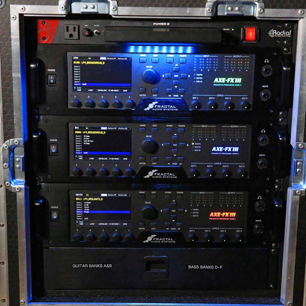 “There’s a few reasons we shifted to the Axe-Fx III,” admits Mitchell. “First, we have enough songs that our rig was getting bigger, more complex, and it had more failure points. We also wanted a clean stage, so there’s no amps, no cabs, no pedalboards onstage, and that’s why on this run we’re now using wireless, too.” Most of his patches are based around either a Mesa/Boogie Mark II C+ (dirty) or Vibro-King (clean). The band enjoys free-range stage access with Shure Axient AD4Q units.