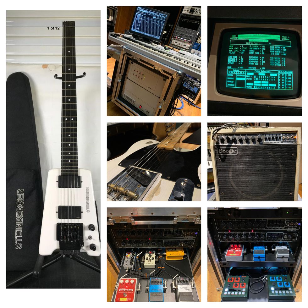 Here’s the bulk of the gear used during the recording of Existential Reckoning and the corresponding Live at Arcosanti album, performed in the depths of the Arizona desert. Starting on the left is the Steinberger GL2T, then a pair of shots of the Fairlight CMI digital synthesizer, sampler and digital audio workstation. Below that is his Fender Custom Shop Esquire reissue and Mesa/Boogie Mark II C+, and the bottom row shows Mitchell’s choice stomps: ZVEX Fuzz Factory, Fulltone OCD, Electro-Harmonix Micro POG, Boss VB-2 Vibrato, Boss FZ-2 Hyper Fuzz, and Radial SGI. The lower-right shows a pair of Oto Machines (BOUM Warming Unit and BIM 12-Bit Delay).