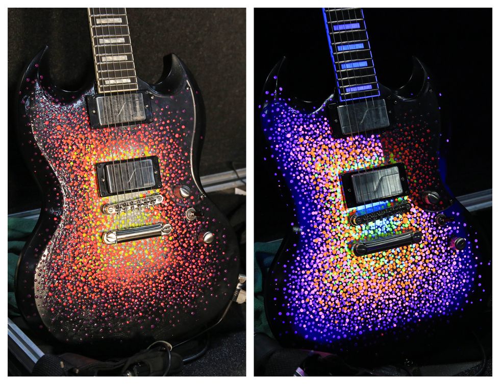 Spencer Stewart joined the electric guitar cult in 2015 when forming the Band CAMINO with Jeffery Jordan. He started the band’s existence with a Strat before being seduced by a Gibson Lzzy Hale Explorer. Ever since he’s been cruising and bruising with ’buckers, but one of his current main rides revs and roars with Fishman Fluence pickups. He prefers to record with these guitars because the Fluences are so dynamic and versatile. Originally finished in a stealth black, Stewart jazzed them up with glow-in-the-dark paint and blacklight speckles that make them both dazzle onstage. The red one takes lead, while the blue one hangs in the second position.