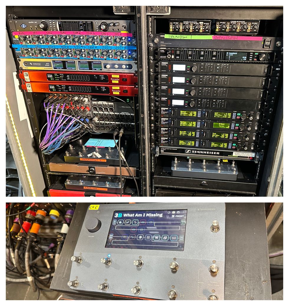 With less than 10 years under their belt as electric guitarists and growing up with tech, Jeffery and Spencer don’t have a lot of the mental pitfalls more veteran players fall into when thinking about live guitar tones. For these two, it’s all about the precision, practicality, and polished sounds they can achieve for a maximum performance that connects directly with the audience. The one-stop solution for those needs is this rolling buffet that starts with Neural DSP Quad Cortex units. Every moment of their show is programmed in these tablet-sized titans. The other hardware in their rack includes Shure PSM 1000s (in-ear monitors), Shure P10T-G10 Dual Wireless Transmitters, Shure ULXD4D Dual Channel Digital Wireless Receivers, Radial Gold Digger 4 Channel Mic Selectors, Sennheiser AC3200-II Active High Power Broadband antennas, Focusrite RedNet A16R MkII 16×16 Analog Dante Interfaces, Ferrofish A32 Pro Dante Multi-Format Converters, Midas XL48 Preamps, and Universal Audio Apollo X6 Thunderbolt Interfaces. This setup can either pilot a moon mission or make for a smooth, flawless rock show.