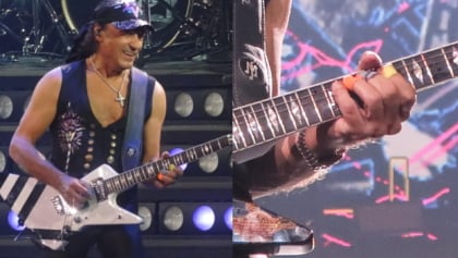 Rock journalist Robert Cavuoto has shared a photo of SCORPIONS guitarist Matthias Jabs performing with his bandmates in New York City a little over a week ago, with the fingertips on Jabs’s left hand covered in multi-colored Band-Aids and blood visible on his guitar’s fretboard.