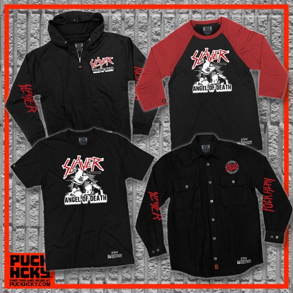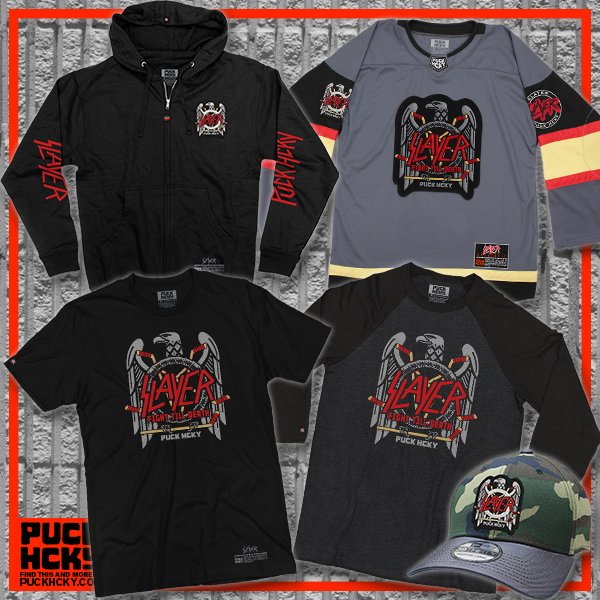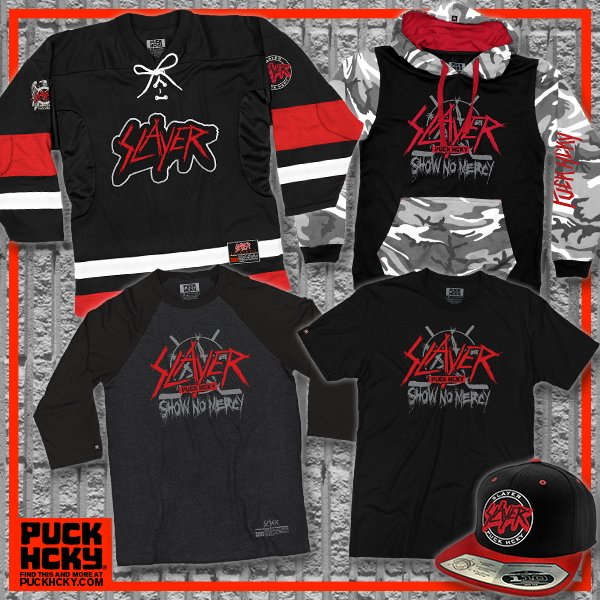 The Puck Hcky x Slayer collection contains many pro-level quality hockey-themed items, like hockey jerseys, pullover and zip-up hoodies, flannels, raglans, t-shirts, hats and decals.