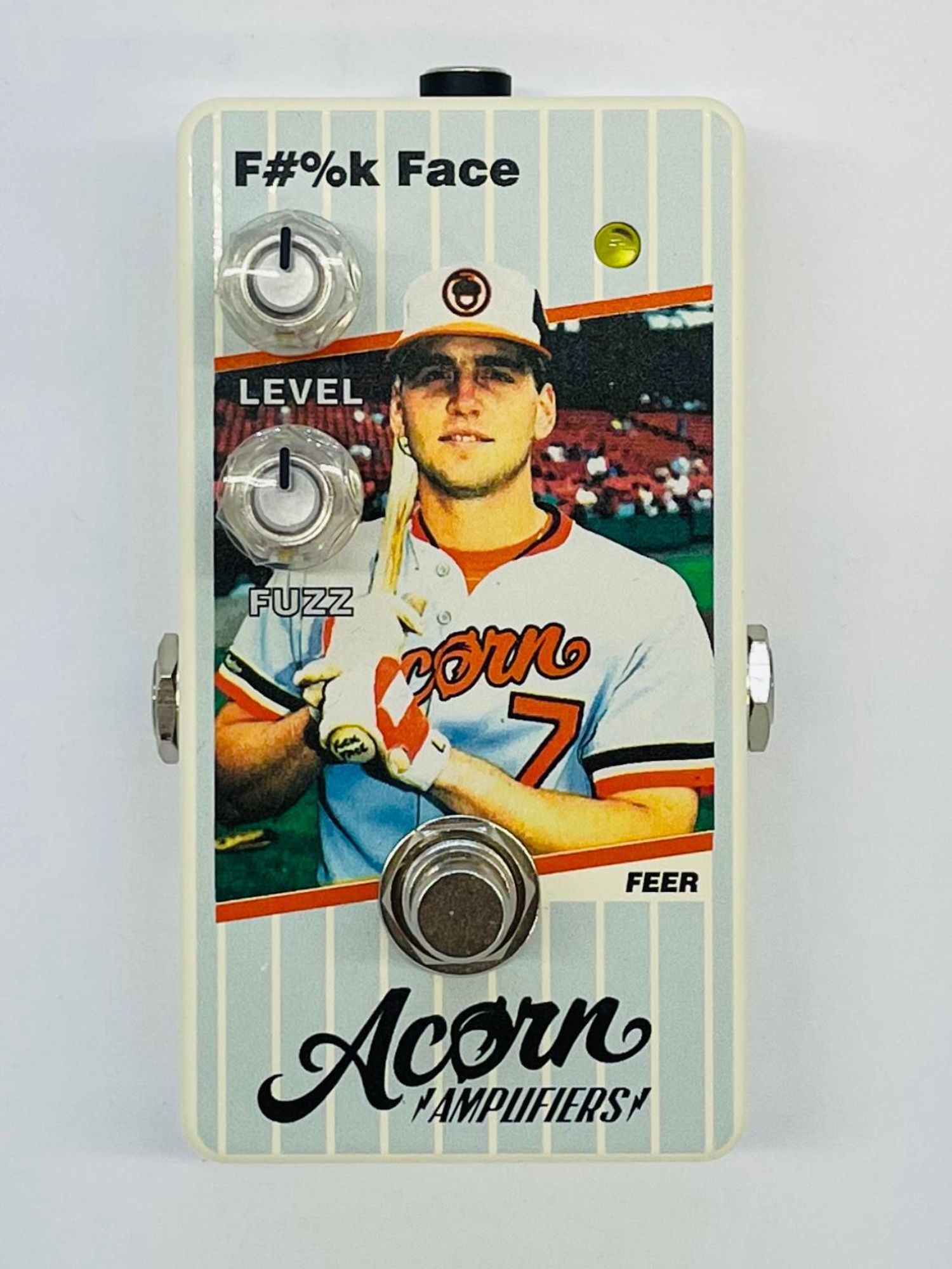 The F#%k Face is a triple gain stage fuzz with thick and meaty sustain that sounds huge in front of a slightly cranked tube amp. Baseball card collectors from the late 80’s will immediately recognize the infamous ‘error card’ graphics of the same name. The circuit is based on the legendary Fuzz with a different Face, but with an additional silicon transistor gain stage and voiced to retain more useable and dynamic fuzz tones all along the sweep of the two controls. In the front of your pedal chain, the F#%k Face will add dynamic interactivity to the volume controls on your guitar which enable a sweep from slight grit to full ripping-velcro breakup.