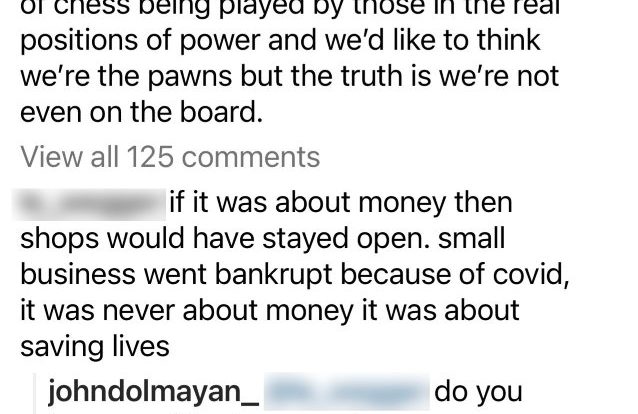 When one of John‘s followers countered that “if it was about money then shops would have stayed open. small business went bankrupt because of covid, it was never about money it was about saving lives”, John fired back: “do you have any idea how much money Amazon made during Covid? Not to mention pharmaceutical companies ? Of course it’s about money”.