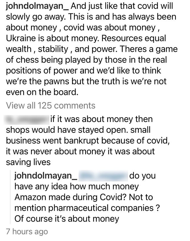 When one of John‘s followers countered that “if it was about money then shops would have stayed open. small business went bankrupt because of covid, it was never about money it was about saving lives”, John fired back: “do you have any idea how much money Amazon made during Covid? Not to mention pharmaceutical companies ? Of course it’s about money”.