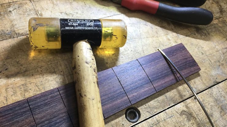 For a guy who hates hammers, I’ve got a lot of them. Sometimes it’s the only tool that will get the job done. One task that a hammer isn’t good at is fretting. Sure, that’s the way it used to be done back in the good old days—you know, when all those unplayable budget guitars were being sold at department stores. I cringe when I see builders smacking a neck with a hammer, and you should too. In a repair shop, there’s room for the hammer as an adjustment tool, but it takes hundreds of hours to get really good at it.