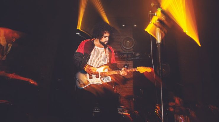 But that freeform, loose, experimental approach ends once the song is completed. When it comes to reinterpreting those tracks live, Romans-Hopcraft plays what’s on the record. “I stick pretty loyal to the recording,” he says. “The live band setup is drums, bass, two guitars, and vocals—everyone’s on vocals—and also another drummer, but his kit isn’t a traditional drum kit. It’s like an MPC with loads of samples taken from the songs. For example, if we’re playing ‘Blame,’ that’ll be a drum break from the original track that I sliced into pieces where he can play the samples like a drum kit. It’s the original sounds, but he can play it.”